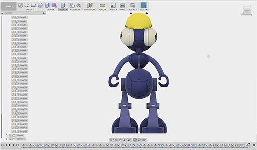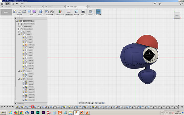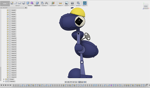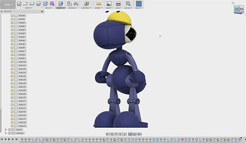 Ora si passa alla realizzazione virtuale del personaggio utilizzando un software CAD. La mia scelta è ricaduta su FUSION 360 della Autodesk che ho trovato piuttosto intuitivo e completo. Qui iniziano i problemi per la natura di questi personaggi dalle forme tondeggianti e irregolari più impegnativi da disegnare rispetto a delle forme geometriche.
