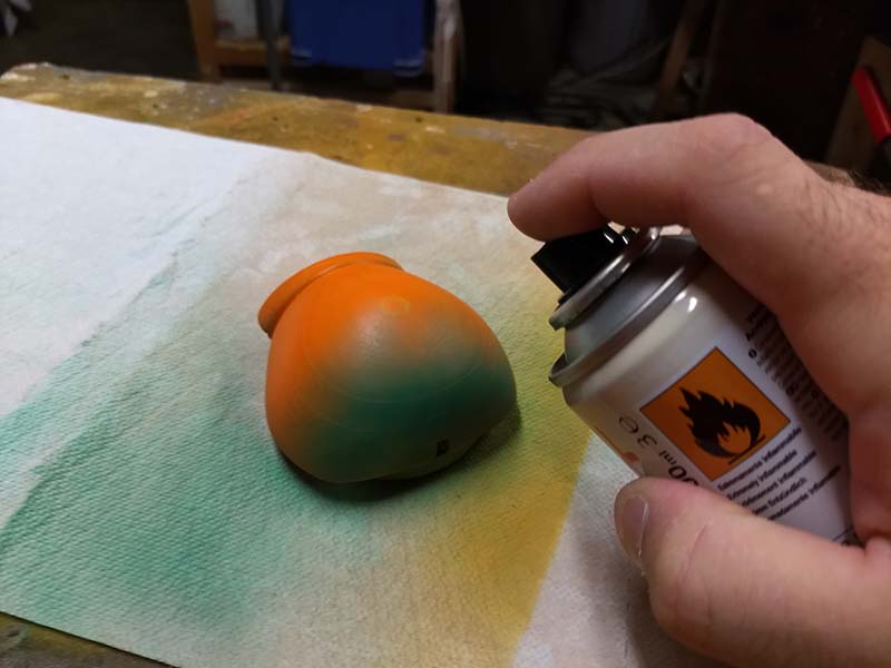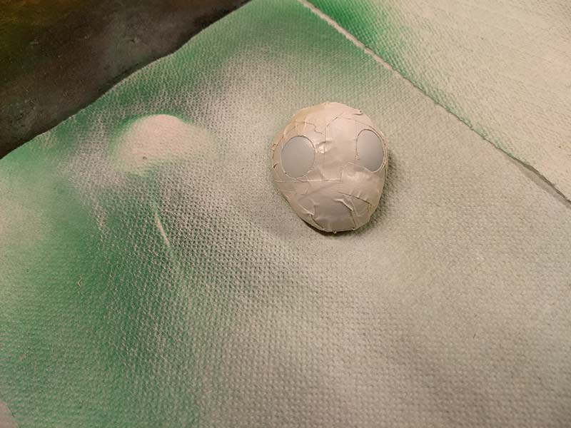 Dato per primo l’aggrappante, vernicio il cranio con il verde smeraldo mascherando il becco e il collo, lascio asciugare e maschero anche la parte appena verniciata lasciando scoperto la parte della maschera dove verrà verniciato il becco con l’ocra giallo, segue la mascheratura per verniciare gli occhi, farò la stessa cosa con le pupille.