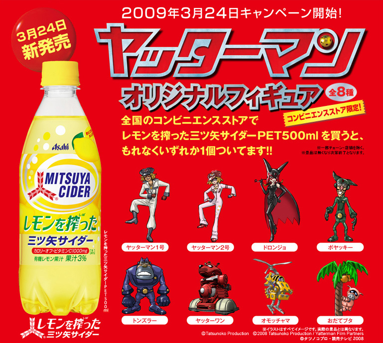 A partire da oggi nelle bottigliette da 500ML al gusto  レモン (re mo n)=lemon la Asashi Soft Drink regalerà 8 tipi diversi di originali action figuers dedicati al film di Yattaman.