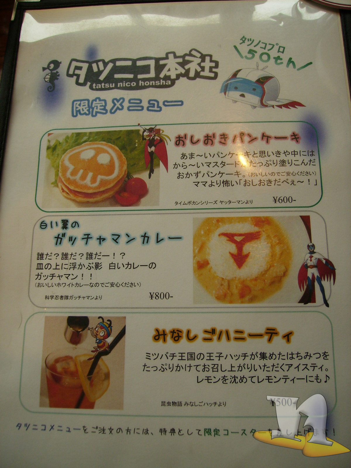 Al SECONDO PIANO c’è la caffetteria dove il menu prevedeva portate a tema e tra i tavoli si potevano sfogliare album commemorativi che spiegavano il lavoro, gli storyboard, i fondali e gli studi di preparazione dei personaggi. Sui televisori in sala nel frattempo scorrevano le immagini dei cartoni animati più famosi della Tatsunoko.