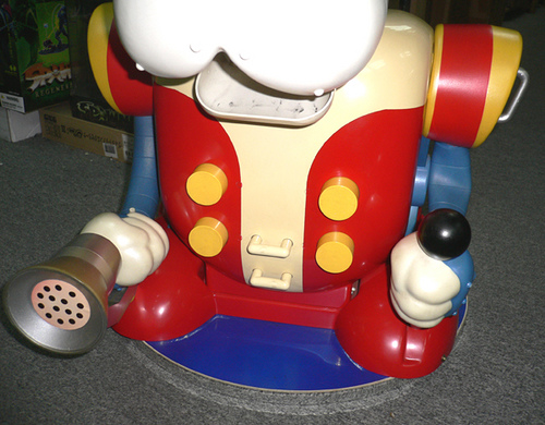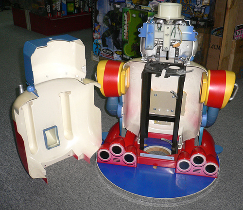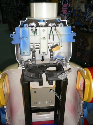 Con 4 batterie AA da 1,5 V si alimentano le lampadine della sirena posta sul cappello e le luci degli occhi. Con altre 3 batterie da 9V invece si alimentano i movimenti.
