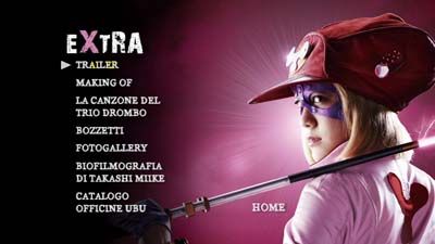 | EXTRA Per me gli Extra non sono un demerito ma solo un merito. Se fanno schifo o mancano non deve inficiare il voto del DVD .Io lo compro per il film! Sono un demerito solo se fanno lievitare il prezzo del DVD causa disco doppio ecc… Qui ne sono rimasto completamente soddisfatto!Abituato ai doppi dischi ripieni di nulla, qui mi sembra un McDonald’s! Un backstage, scene eliminate e la filmografia di Miike: per chi vuole approfondire ha materiale con cui cimentarsi. | ![]() |